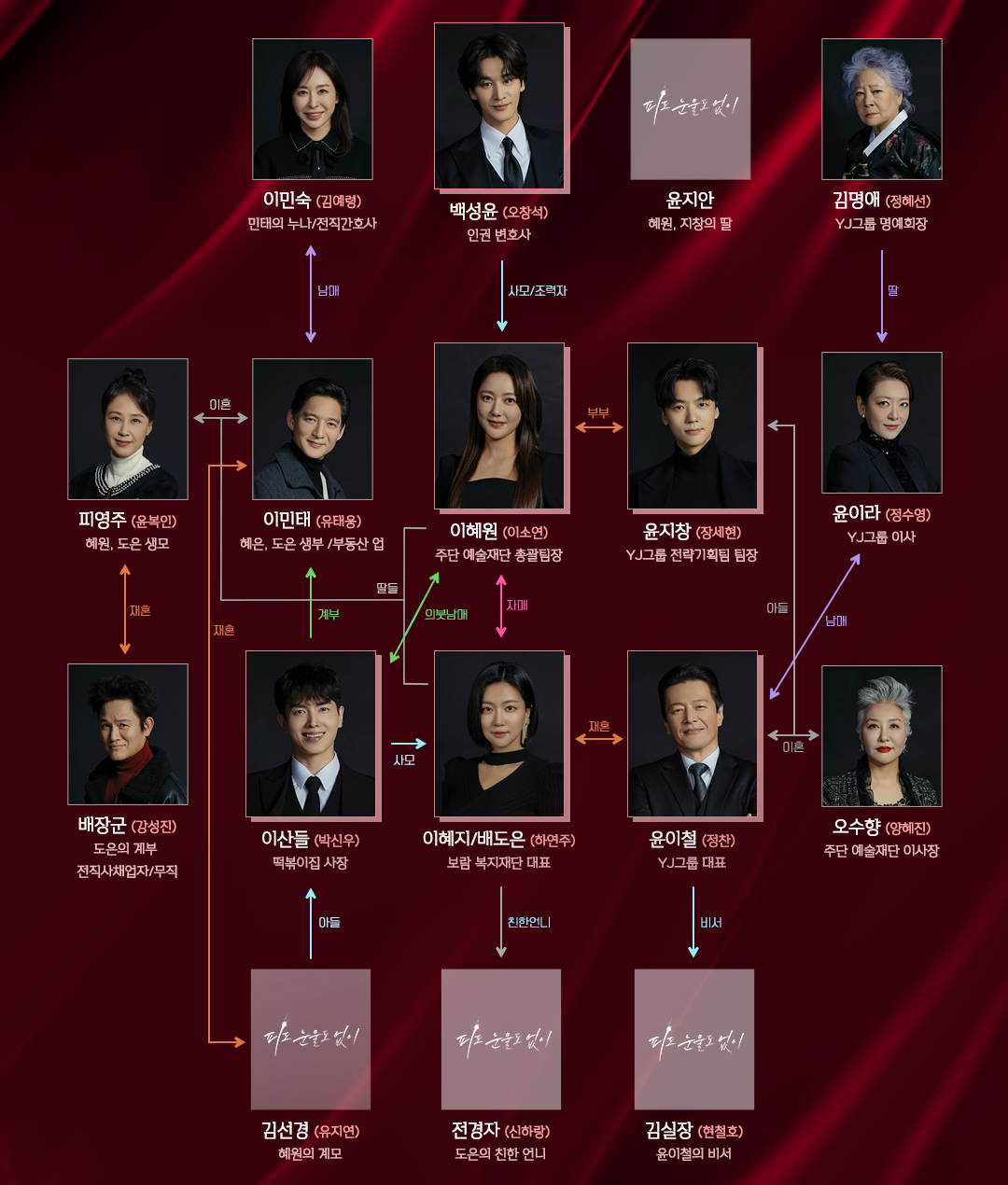 배우 오창석은 인권 변호사 백성윤 역을 맡아 이혜원을 짝사랑하는 인물로 등장합니다. 이혜원의 남편 윤지창은 가족의 비극적인 과거에 휘둘리는 캐릭터입니다. 이 외에도 여러 인물들이 이 복잡한 인물관계도에 등장해 드라마에 풍부한 이야기를 더합니다.